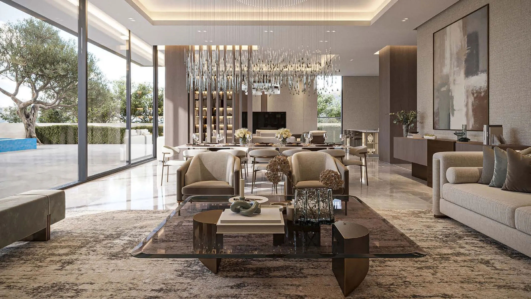 The villas feature generous living and dining areas, multiple en-suite bedrooms including dual master suites, and floor-to-ceiling windows that frame lagoon views and allow natural light throughout the home. Residences are finished with premium materials and include private swimming pools, landscaped gardens, spacious terraces, and basement levels with ample parking and entertainment or leisure spaces. Every element of the design reflects a focus on exclusivity, comfort, and refined family living.
