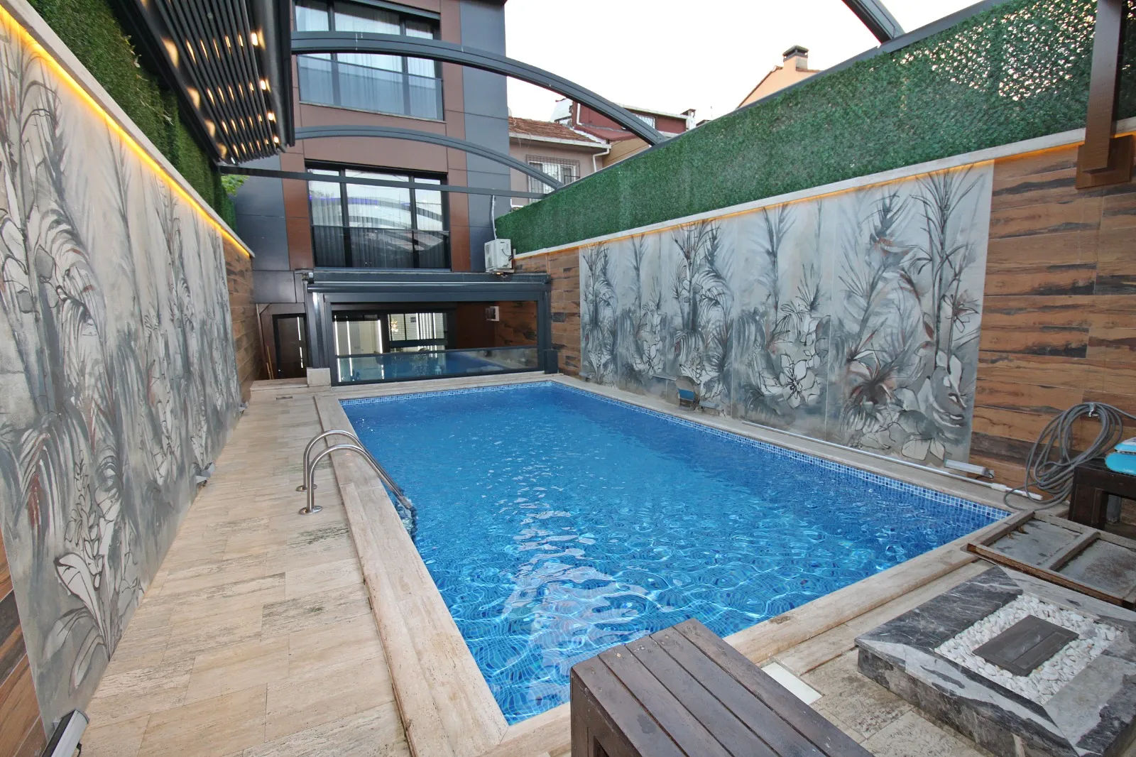 havuzu ve titizlikle düzenlenmiş bahçe huzur ve davetkar bir