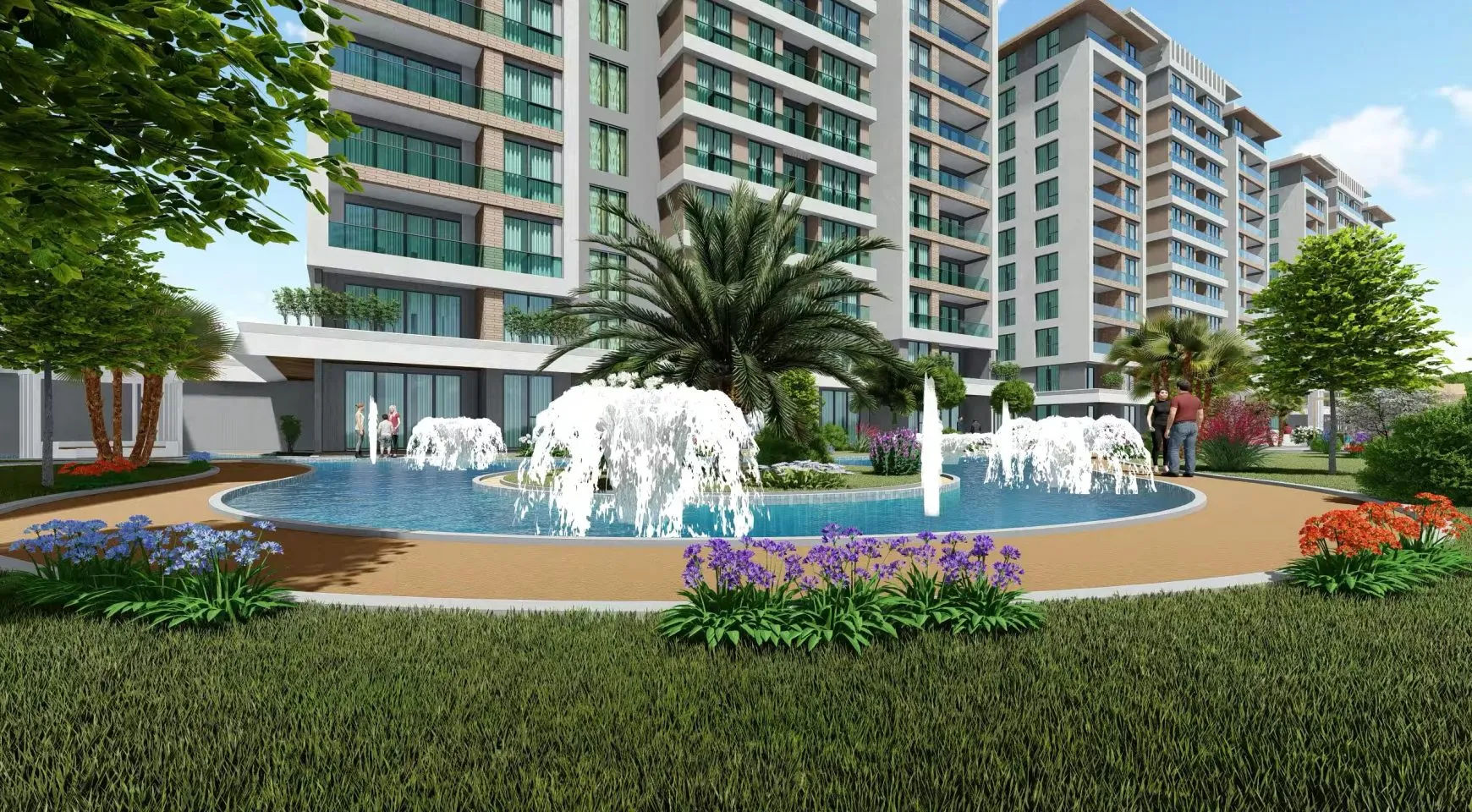 - Renkli peyzaj alanı ve süs havuzları