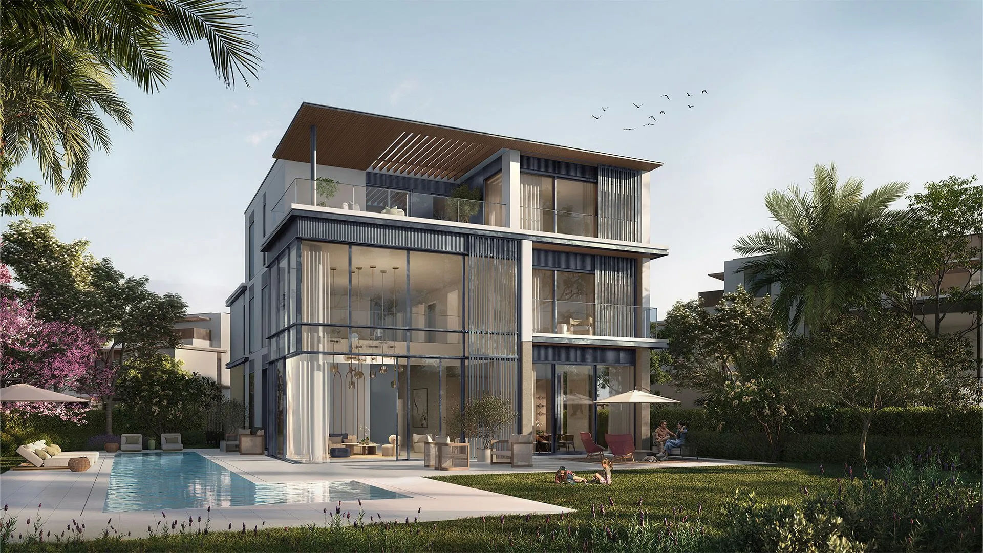 - 4 ila 7 Yatak Odalı Müstakil Villalar: Bu görkemli G+2 konutlar, banliyö yaşamının zirvesini temsil etmektedir. Çift yükseklikte yaşam alanları, iç asansörler (bazı ünitelerde) ve geniş çatı terasları ile yemyeşil manzaraya ve ikonik Dubai silüetine panoramik manzaralar sunmaktadır.