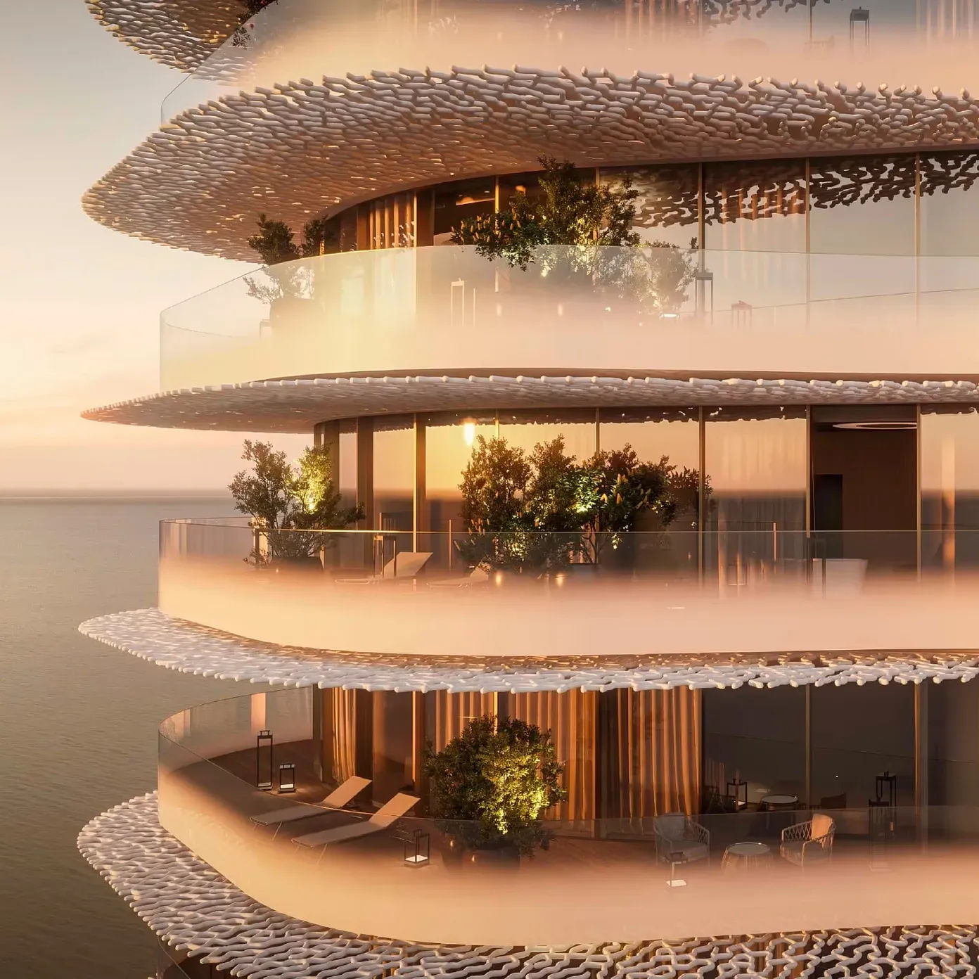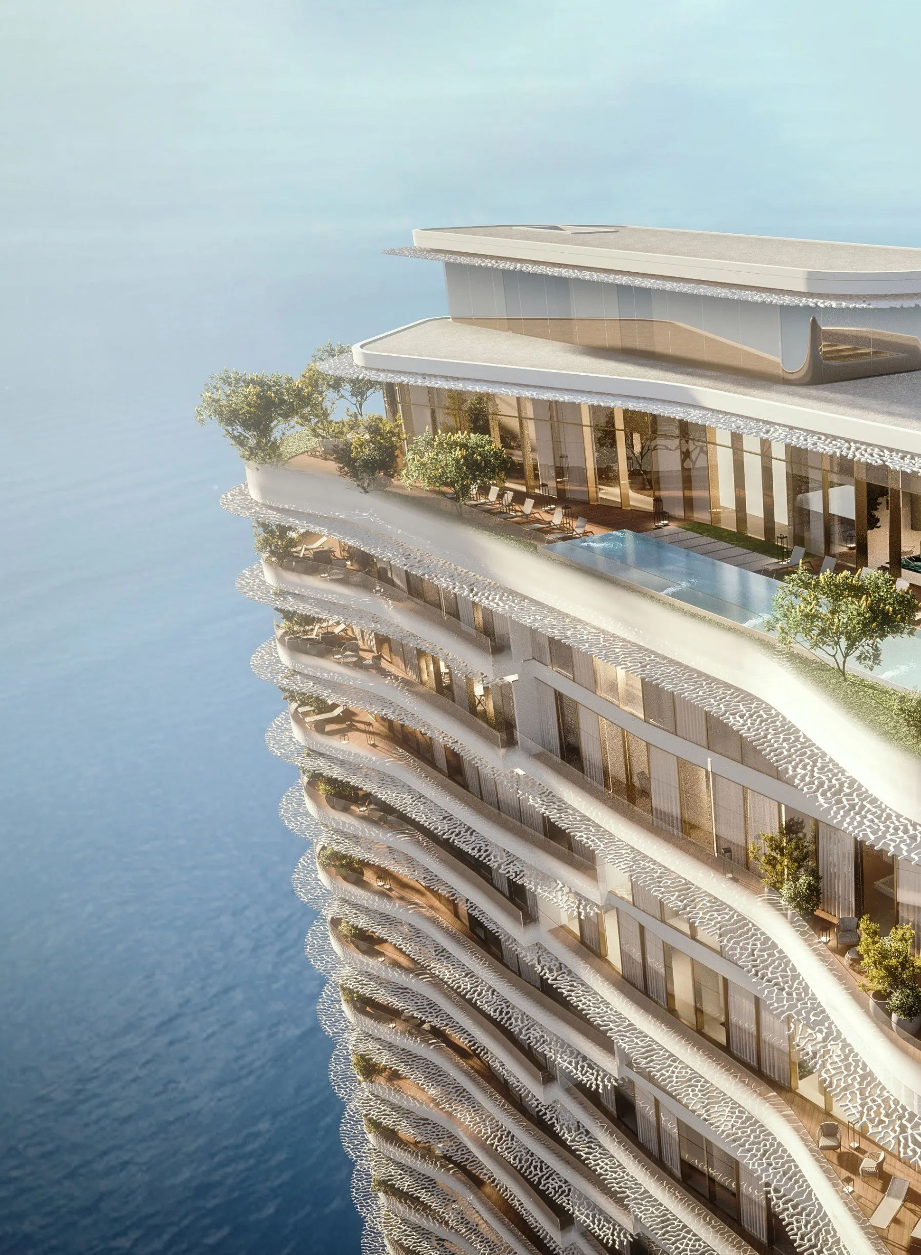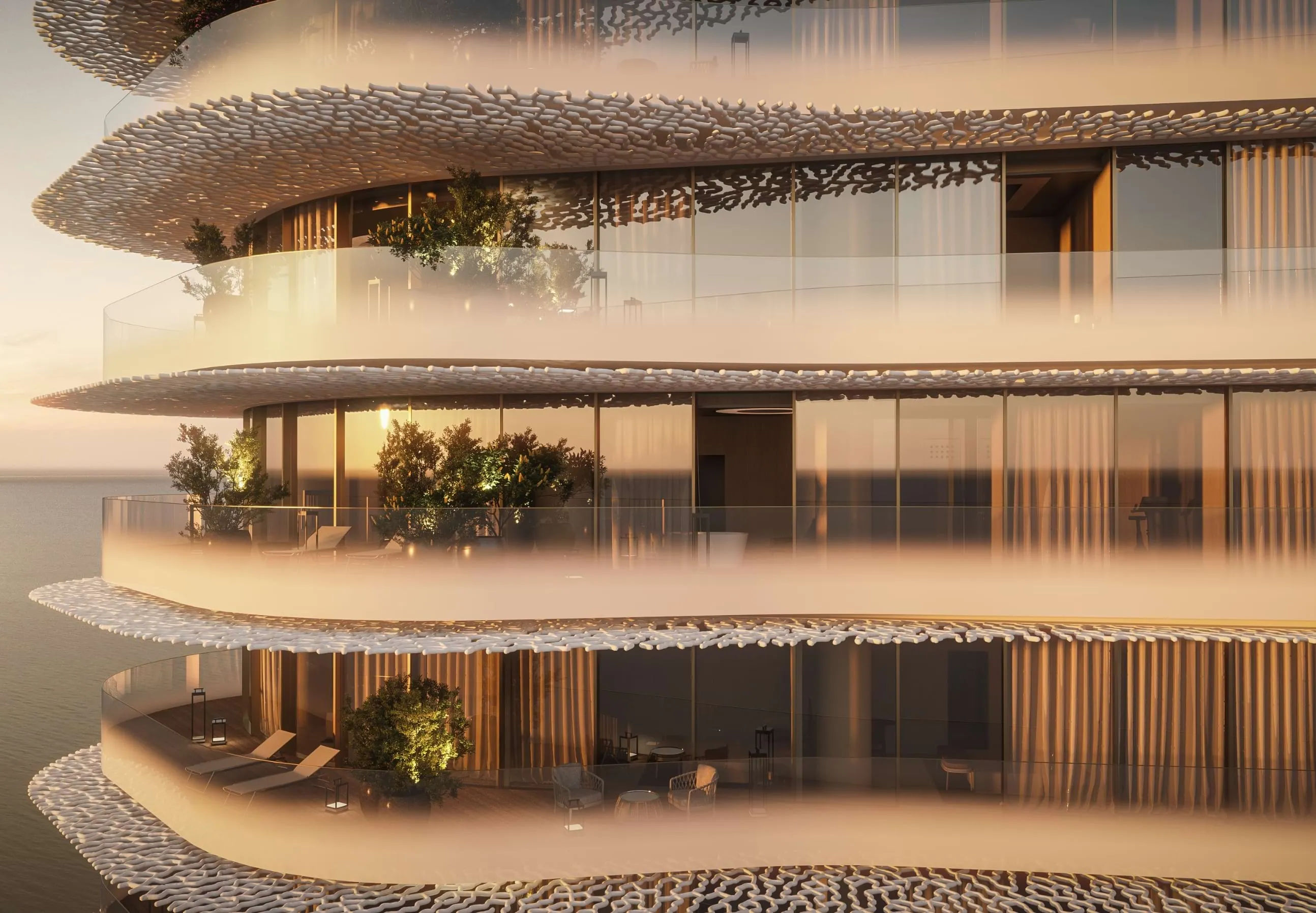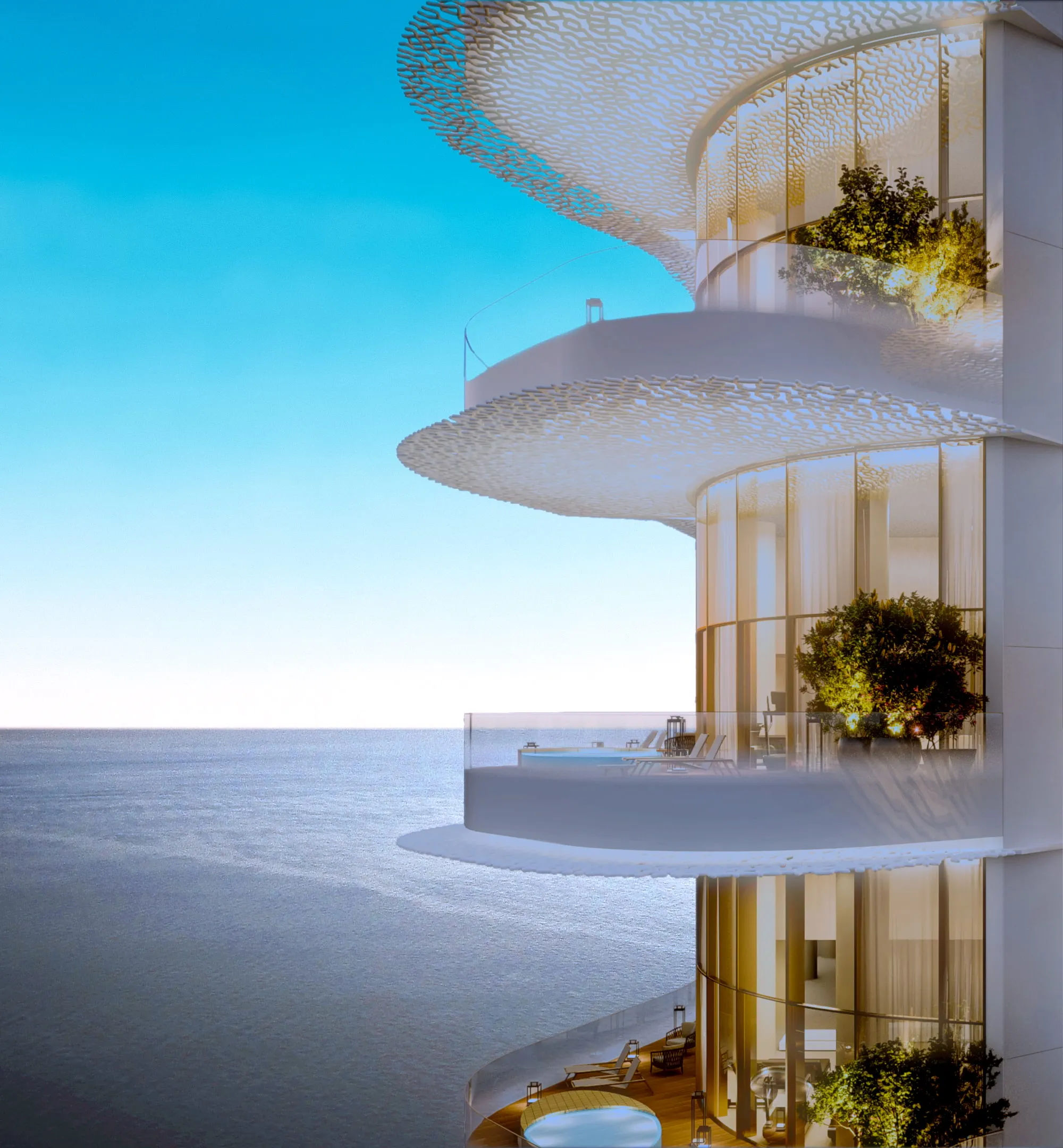 The Marina Lofts consist of a limited collection of duplex residences that emphasize open-space concepts and meticulous attention to detail. Each home is a study in contemporary design, featuring golden limestone claddings, floor-to-ceiling glass volumes, and private terraces that overlook the shimmering marina.