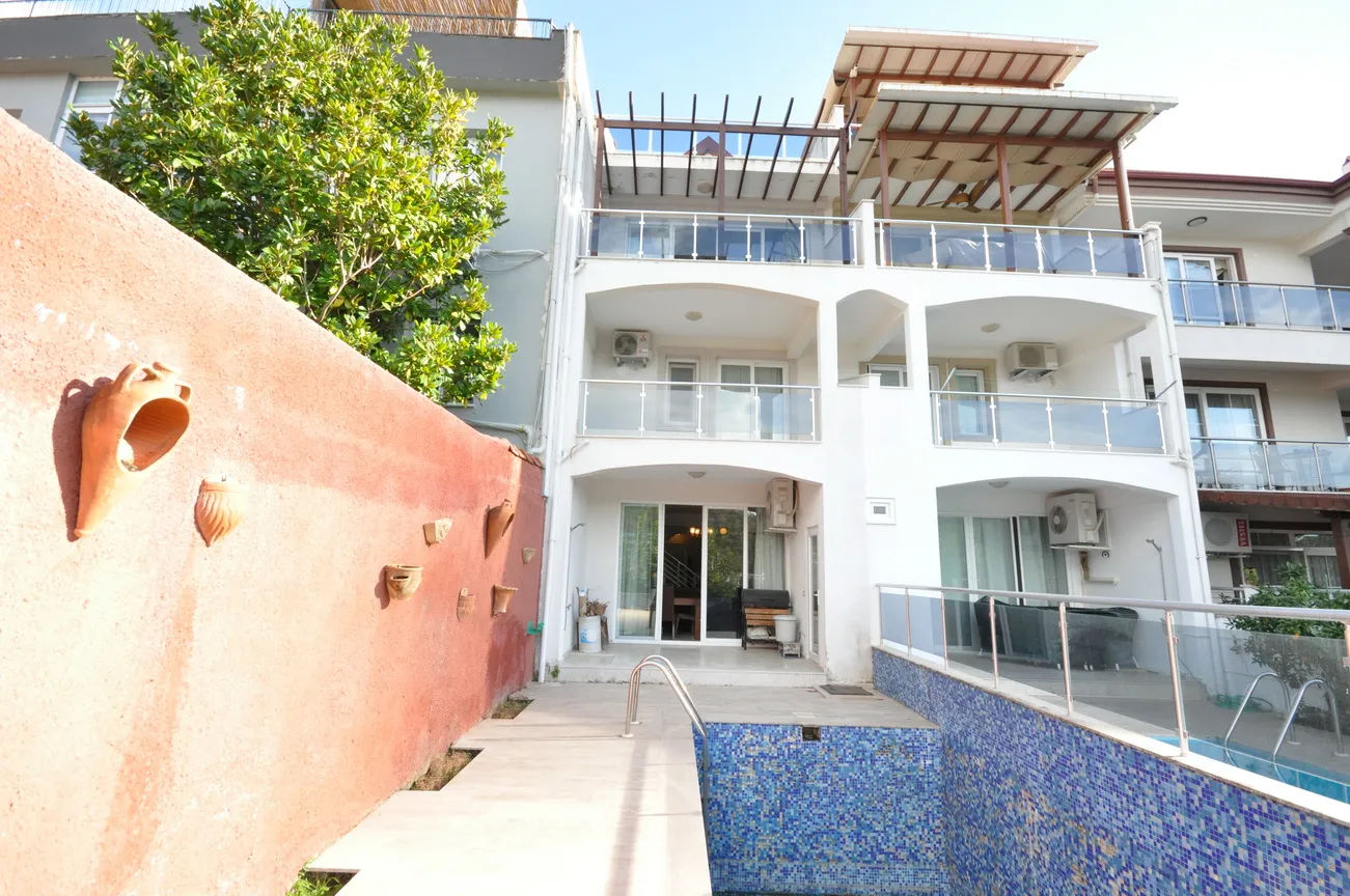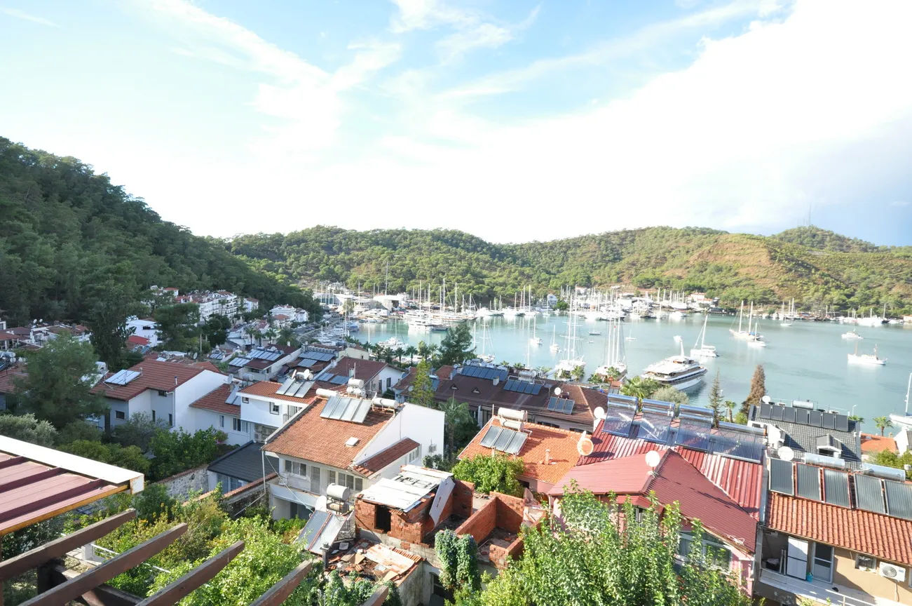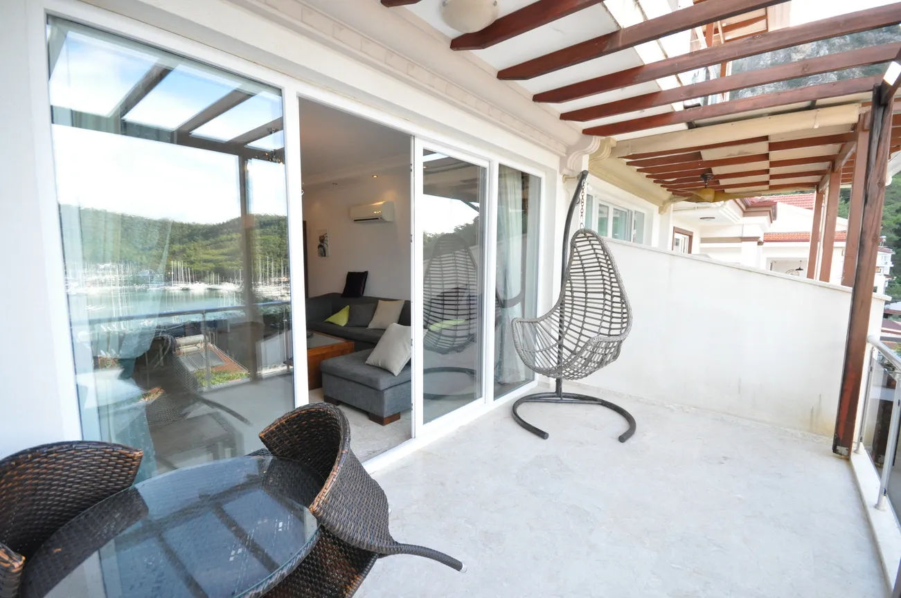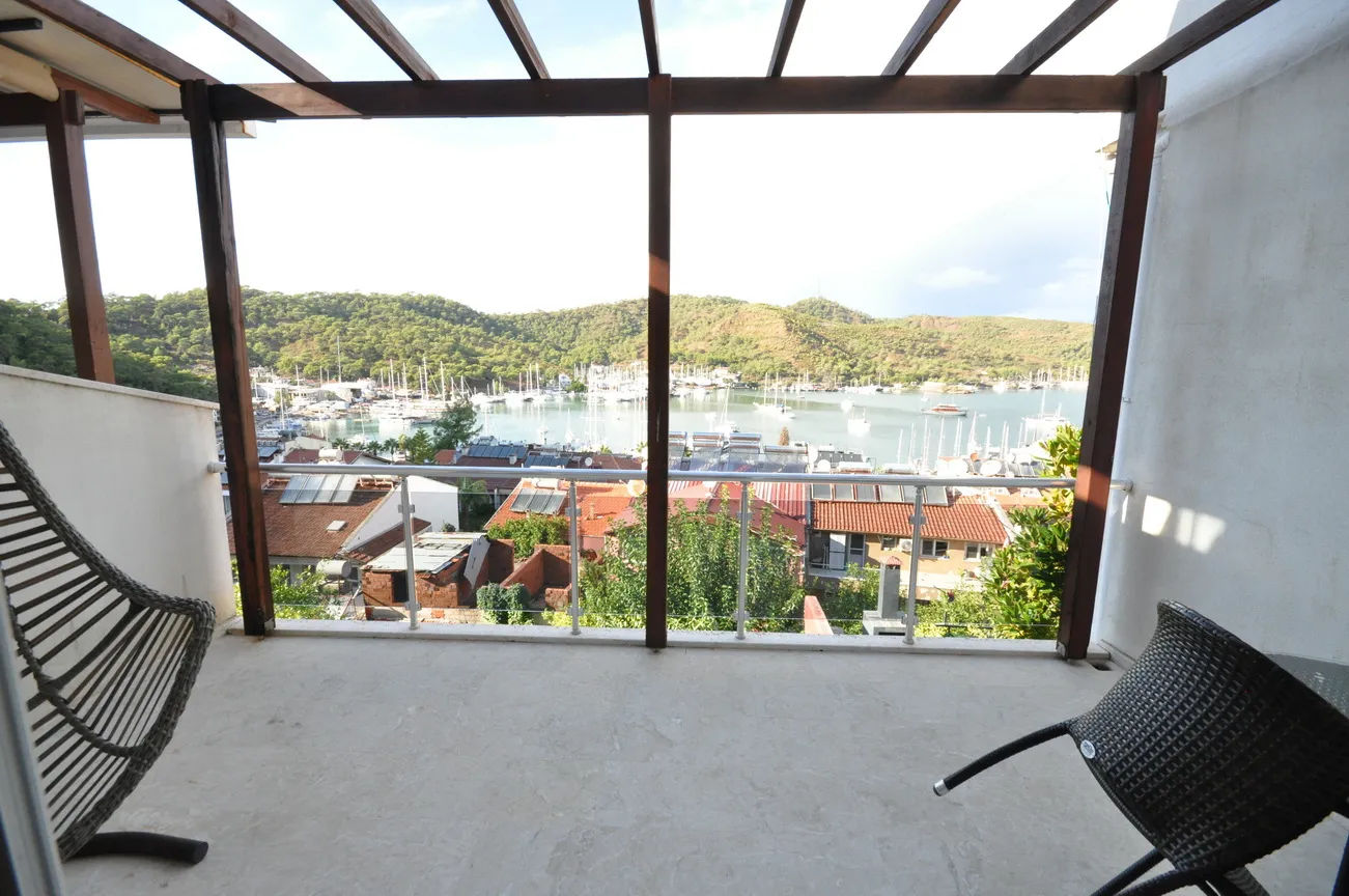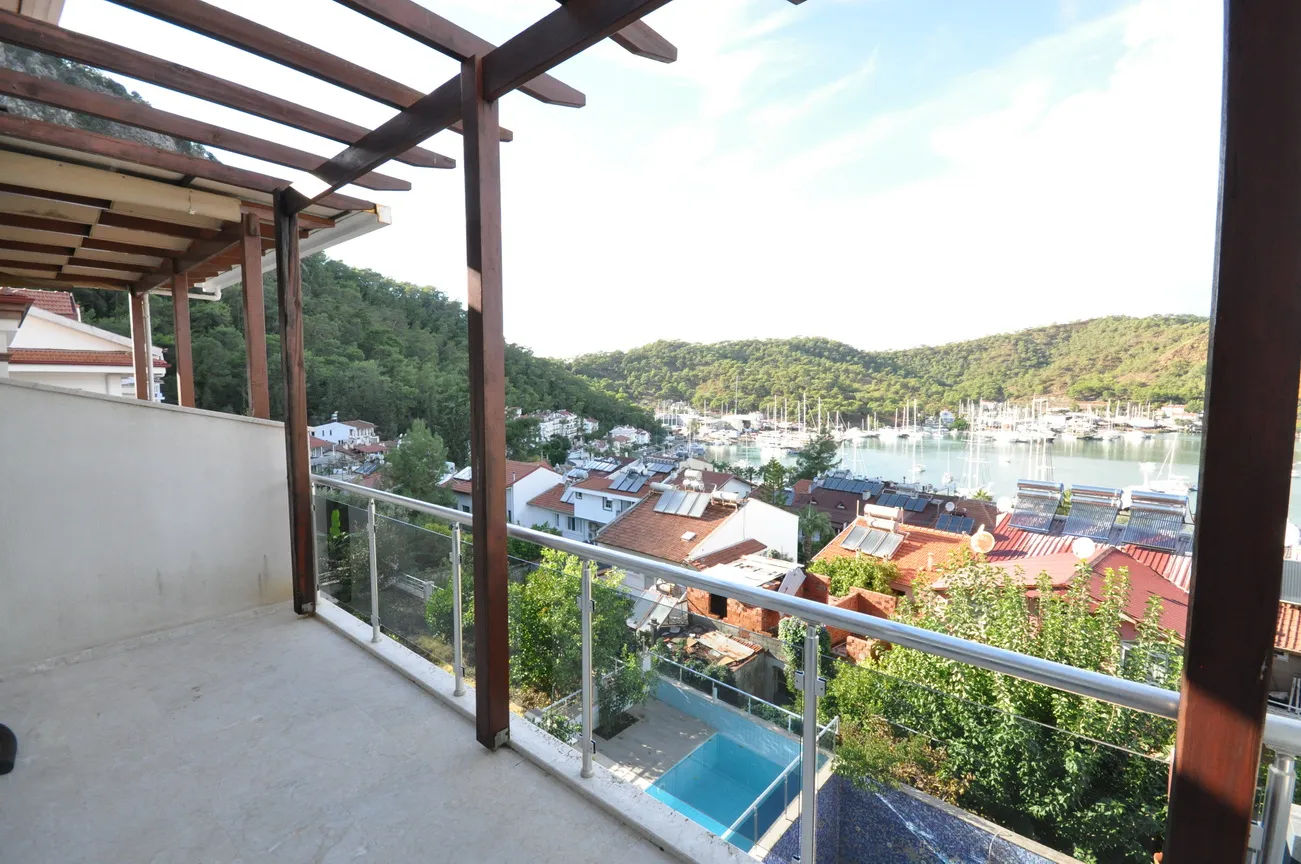 This sea-view villa for sale in Fethiye offers 120 sqm of living space in the sought-after harbor district of town. On the living floor, you can enjoy the wonderful view of Fethiye both in winter and in summer, with a large living room and kitchen, and a large front terrace.The furnished living room is also open to a generous size balcony dominating the whole view ahead. This area is perfect for gathering and spending quality time inside. Decorated with an elegant taste, the kitchen with an abundance of storing areas for all your kitchen items is separated. Furthermore, the lower ground floor where the swimming pool and sunbathing area are situated, so you can sunbathe as you wish, away from foreign eyes, and enjoy Fethiye, which is sunny for 300 days a year.
