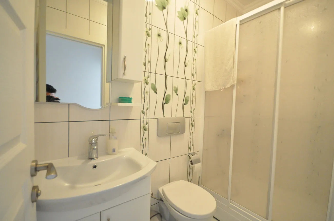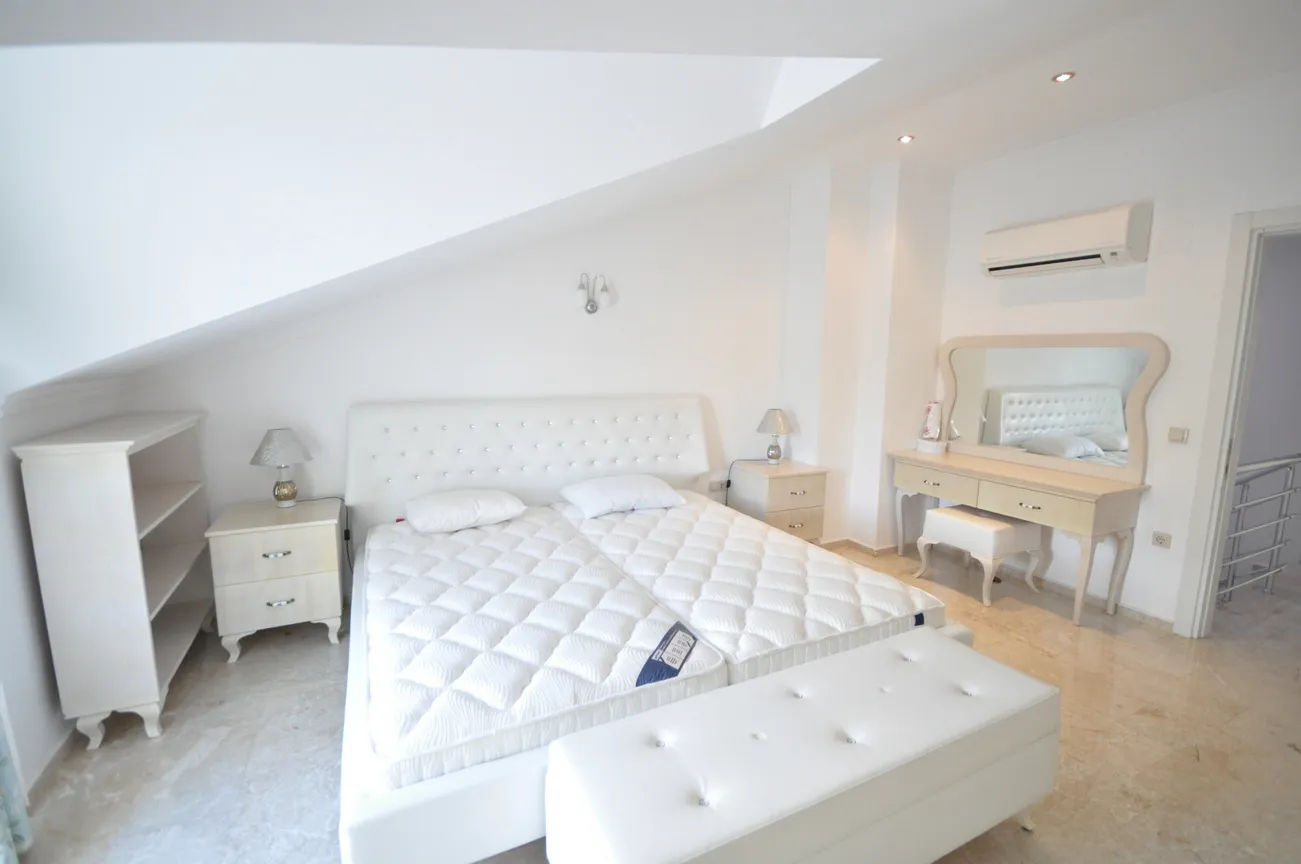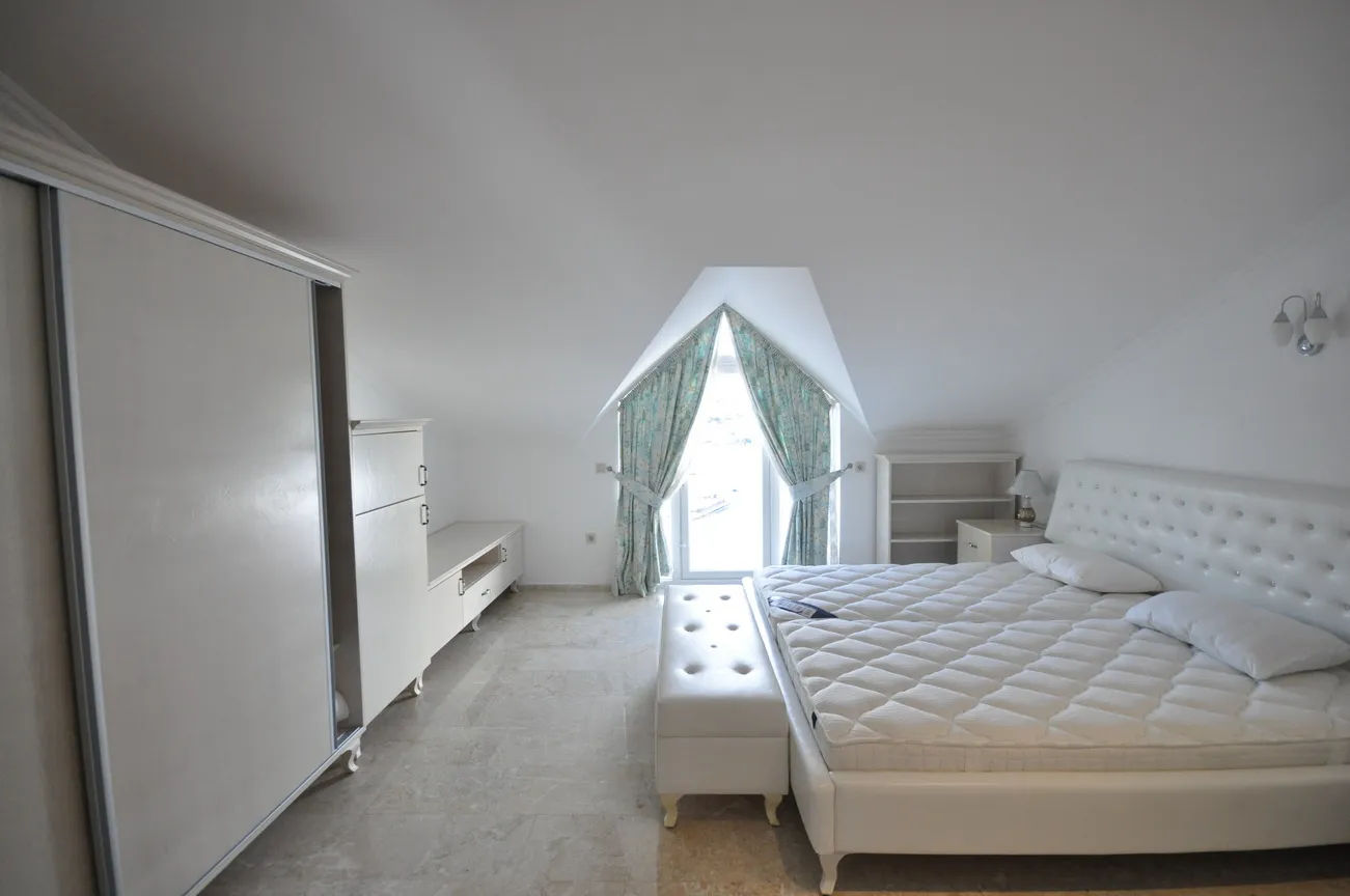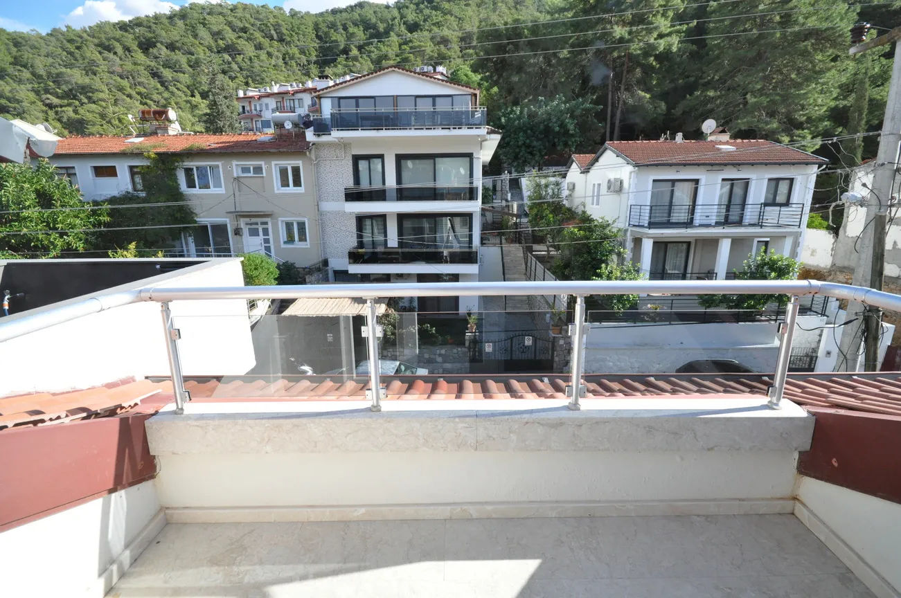 On the upper floor, there are 3 bedrooms with a view of Fethiye from the window and balcony on the front and a bathroom belonging to these bedrooms, and another bedroom with a balcony and an en-suite bathroom on the back. There are two bedrooms with balconies and bathrooms on the roof floor. The bathrooms are filled with top quality materials, comfort-oriented style, and large-enough spaces to meet all your needs.