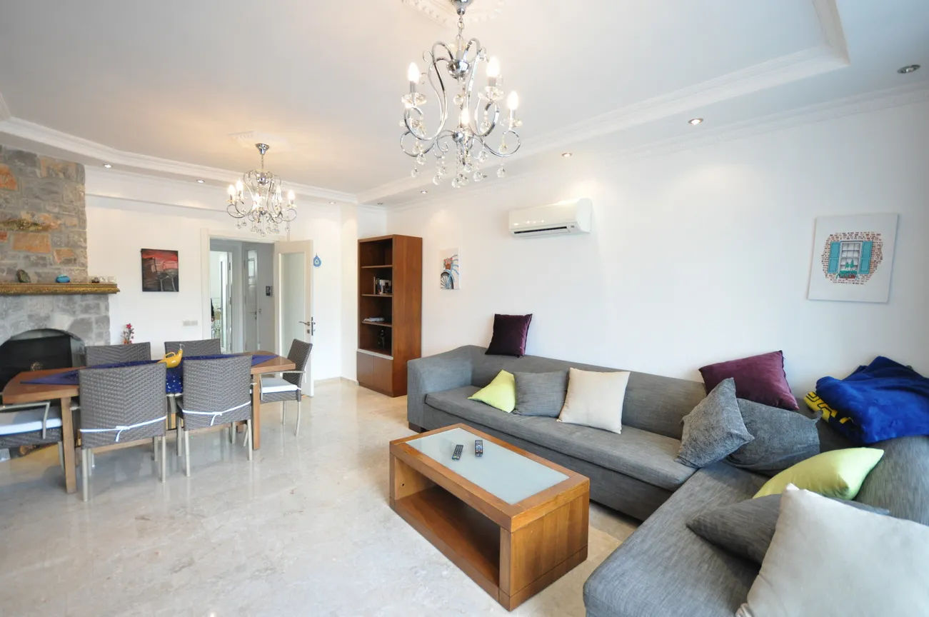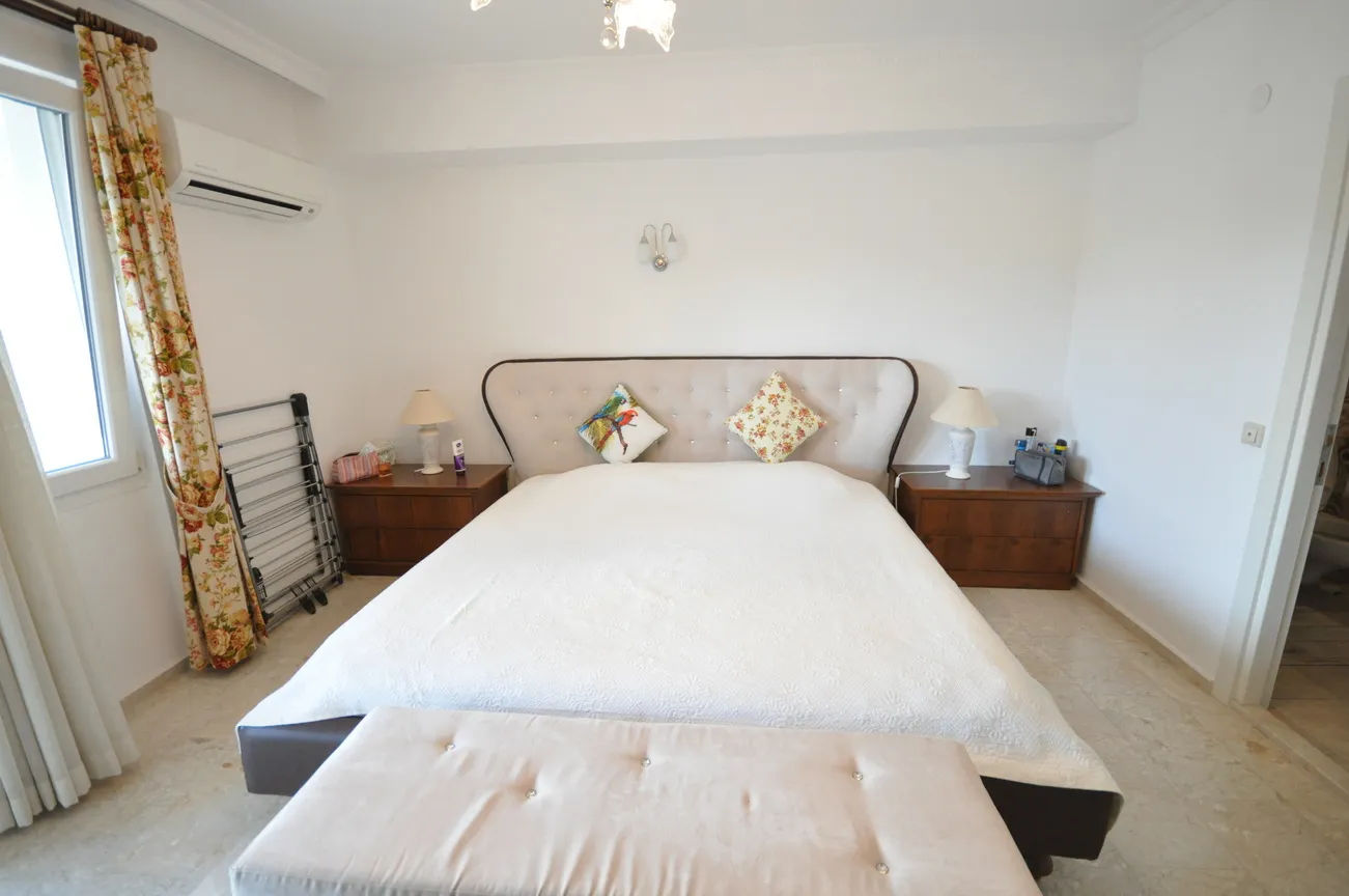 This furnished villa, which has a view of Fethiye Marina, Knight Island and almost the entire Gulf of Fethiye, is located in Karagözler District. It is approximately 500m from the center of Fethiye. There is a private open parking space for your car. Local bus to the town center that stops close to the villa, offering easy access to shops, banks, a cinema and harbor-side walks. There is also a good selection of coffee shops, restaurants and bars nearby.