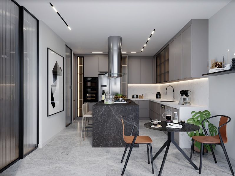 tüm alanı sunuyor. Ayrıca, oturma odası ve mutfaktaki fonksiyonel